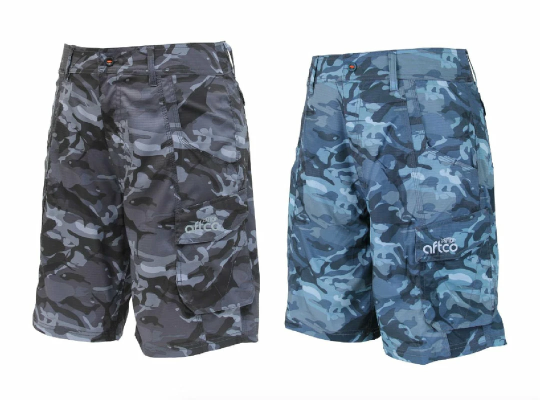 Meet the next generation of AFTCO shorts, featuring lightweight ripstop camo.  The Camouflage Tactical fishing short features an exclusive AFTCO fish silhouette hidden within a blue camo,  green camo, and grey camo print. As with our Stealth shorts, the Tactical men’s camo fishing shorts sport AFGUARD stain resistance, AFLEX 2-way stretch and AFBLOCK sun protection. Tactical Fishing Short features AFTCO’s Active Fit for a true-to-size fit for optimal on the water performance.