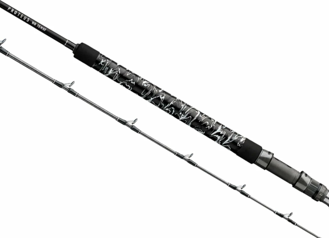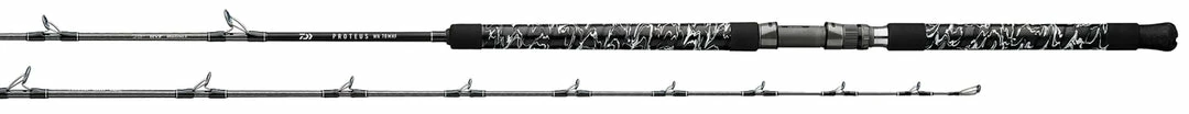 The Daiwa Proteus WN Saltwater Rods are class rated for both monofilament and braided lines and are perfectly suited for today’s saltwater angler. The conventional rod blanks are built with the exclusive X45 Bias Graphite Fiber which reinforces the blank and prevents twisting when the rod loads up. The exclusive Braiding-X carbon fiber braiding technology provides added blank reinforcement further reducing blank twist. The spinning rod blanks incorporate High Volume Fiber (HVF) modulus carbon graphite construction with more volume of fibers and less resin which gives the rods a lightweight, strength and sensitivity. The D-VEC WINN Grip Tape provides a soft, comfortable, yet firm grip throughout the troubles of landing a tough saltwater gamefish. The solid and secure Fuji Reel Seats feature a woven insert. The blanks are wrapped with Fuji Fazlite Ring Guides.