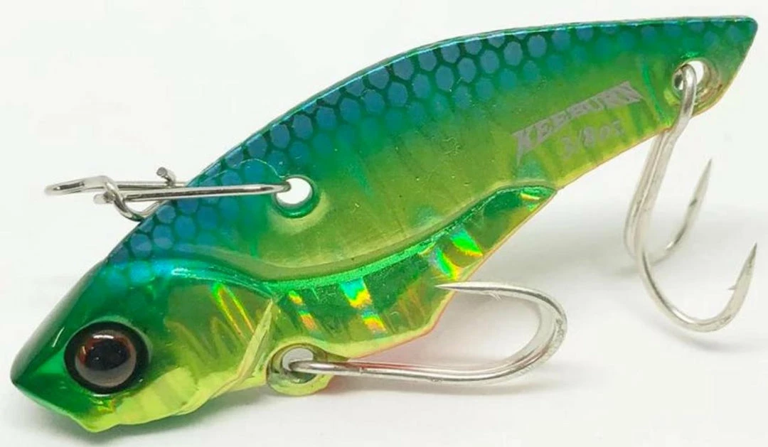 The Jackall Keeburn Blade Bait is comprised of a unique mixture of metal and circuit board material that results in an amplified vibration. Sending reverberations through your hand the moment the reel handle starts to turn, the Jackall Keeburn Blade Bait’s head remains still while the bait shimmies, stabilizing the bait at high speeds. Offered in a number of high quality finishes, the Jackall Keeburn Blade Bait uses a new take on traditional blade bait design to achieve a strong wobble and unmatched attraction.