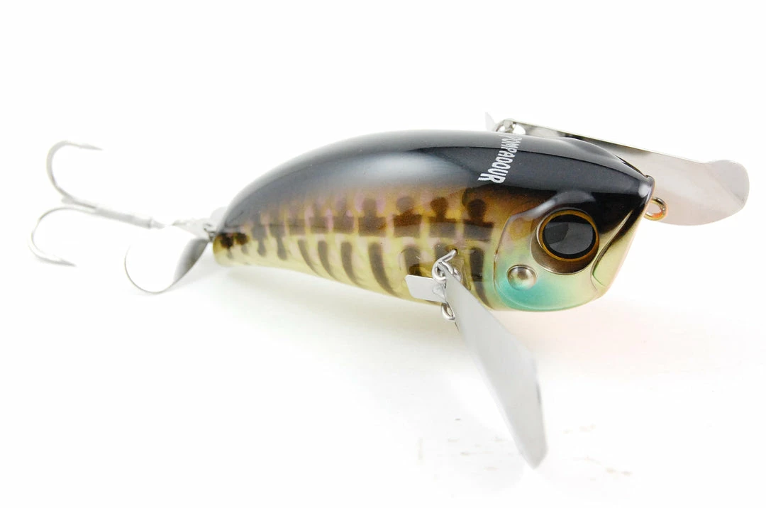 The Jackall Pompadour features two unique metal wings that, upon casting, tuck away tight to the body for those long casts. Once the lure hits the water and you begin the retrieve, the metal wings open up creating a very unique wobble and a huge wake.
