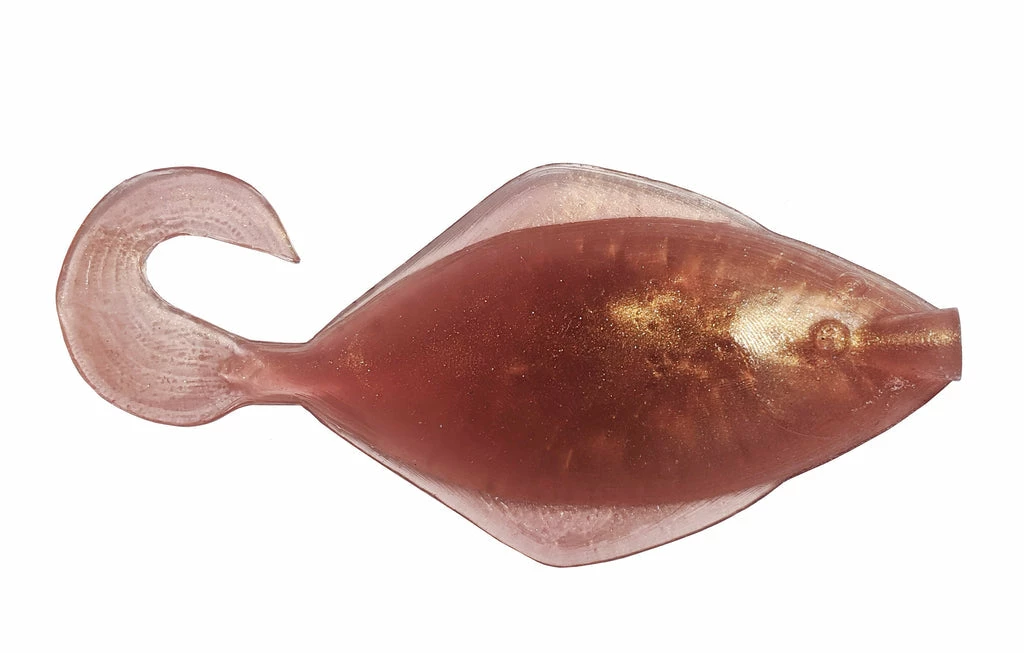 The Madame Sand Dab is 7 inches in length with a small grub tail to provide vibration. It’s fished best with a 6 or 8 ounce lead head lightly jigged off the bottom. Some people have pinned these baits to a single dropper loop as well with great success!