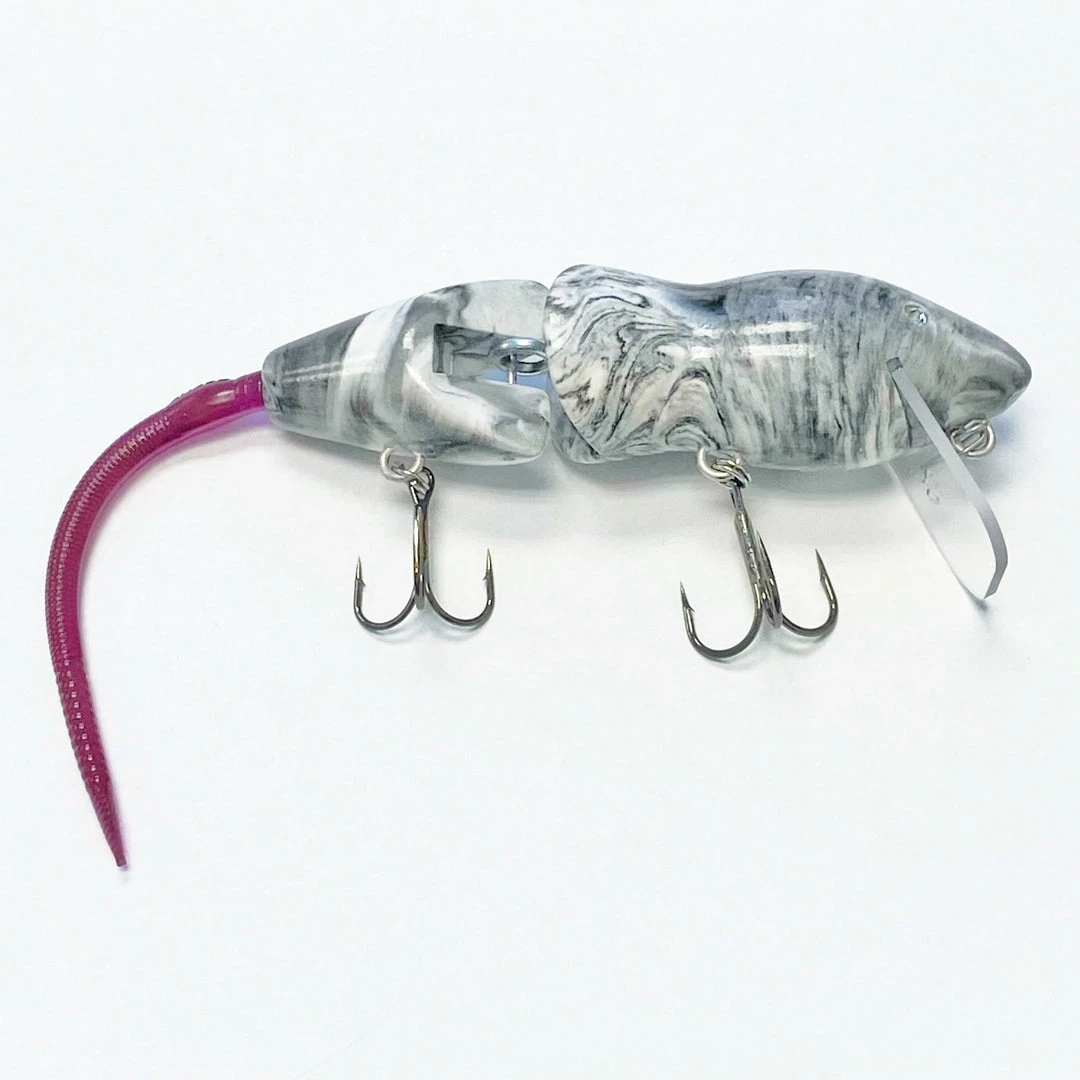 The PB Rat Wakebaits come stock with gnarley VMC Split Rings and Owner Stinger Treble size 1 in the rear and 1/0 in the front.  PB Rats do come in solid colors however the swirl patterns are unique and no two swirl patterns are the same. Tail colors may vary and are held on with a screw lock and can be easily changed after being chewed.